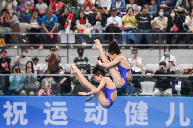 3月19日,陈芋汐(左)/全红婵在比赛中。新华社发
