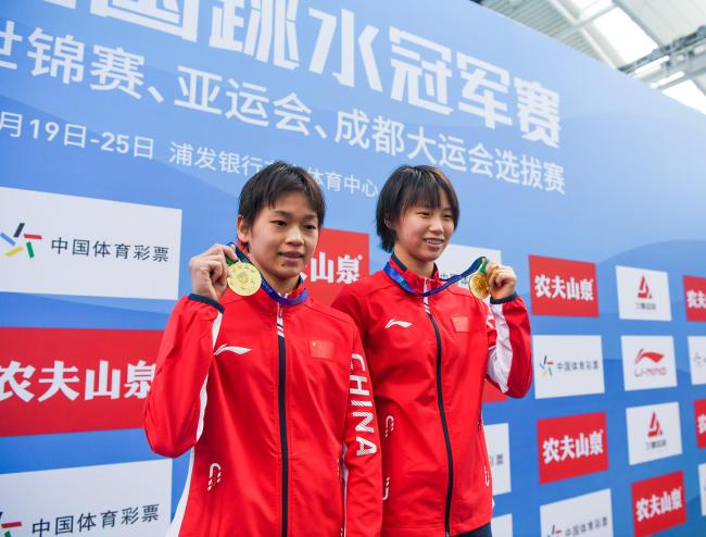 3月19日,陈芋汐(右)/全红婵在赛后展示金牌。新华社发