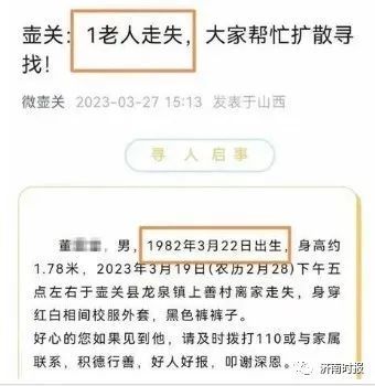 3月27日,微信公众号“微壶关”在头条位置发布了一篇寻人的文章,标题是《壶关:1老人走失,大家帮忙扩散寻找!》。内文中称,董某某是1982年3月22日出生,3月19日在壶关县龙泉镇上善村离家走失。文章所附的寻人启事显示,董某某有先天性精神疾病。